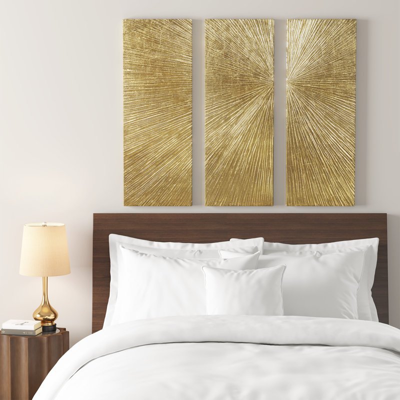 Illuminate your space with the captivating elegance of the Sunburst Hand Painted Triptych Wall Art Set. This striking 3-piece set showcases a modern abstract sunburst design, enhanced by a gold metallic finish that adds warmth and sophistication to any room. Crafted from dimensional resin with a heavy texture detail, each panel brings a gallery-worthy presence to your décor. Each piece is thoughtfully designed for vertical hanging with D-ring hangers, making installation effortless. Whether placed in a living room, dining area, or entryway, the shimmering gold tones and dynamic design create an eye-catching focal point.Transform your home into a space of refined luxury with the Sunburst Triptych Wall Art Set — a stunning reflection of modern artistry.